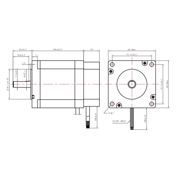| Model | Holding Torque | Rated Current | Resistance per phase | Inductance per phase | Detent torque | Rotor inertia | Lead wire | Motor length |